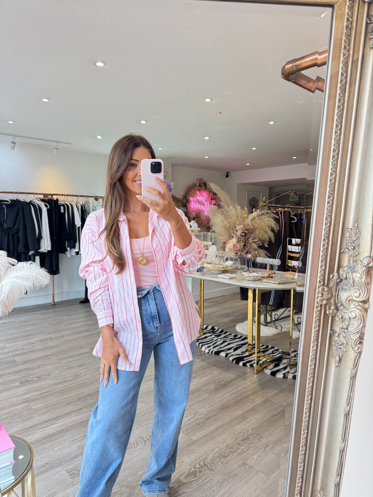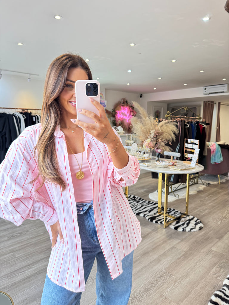 Pink & red striped button through blouse