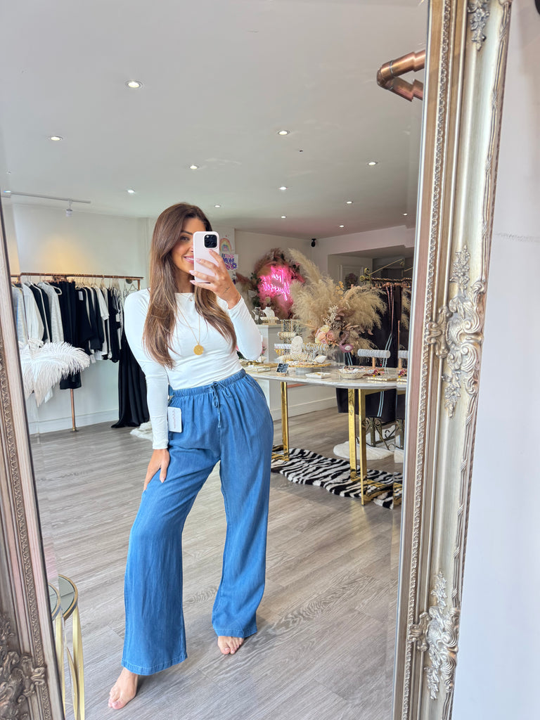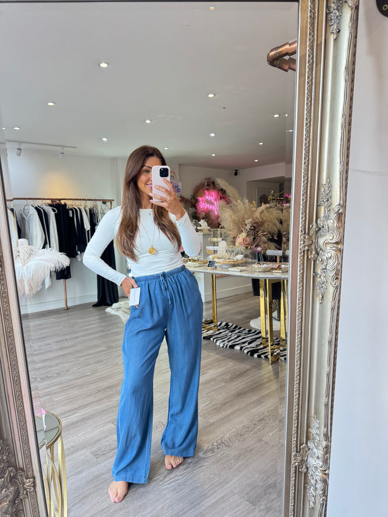 Chambray denim pocket flowy trousers